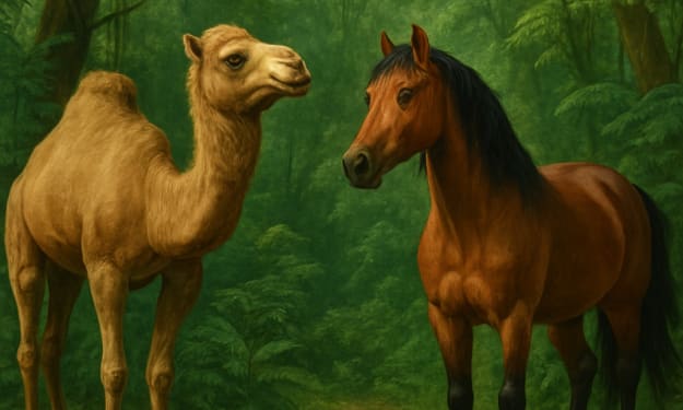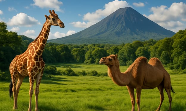 Giants of the Green: A Tale of the Giraffe and the Camel The sun stretched its golden arms over the lush, endless fields, casting long shadows from towering trees that whispered with morning wind. At the edge of a green forest, beneath the watchful eyes of a great mountain cloaked in mist, an unusual pair wandered side by side—a giraffe named Tula and a camel named Barak.