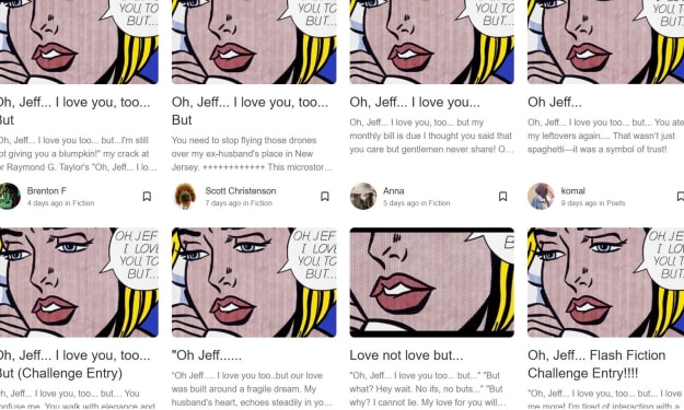 What can I say? The results of this challenge have been nothing short of phenomenal. A few weeks ago, I posted a copy of Roy Lichtenstein, Oh Jeff I love you, with a suggestion to complete the story that the artist left hanging with the speech bubble words.