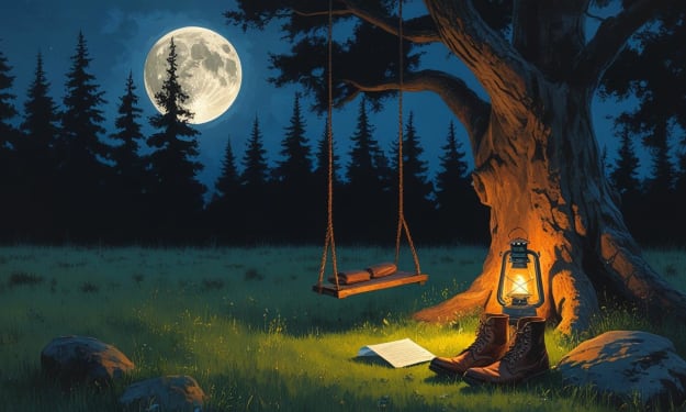 A Love Rediscovered in Moonlight In the quiet of Haven’s Meadow, where pines stood like guardians under a silver moon, an old oak held court, its branches cradling a wooden swing that swayed gently in the night’s breath. A lantern flickered on the grass, its golden light brushing against a pair of worn boots and a folded letter, pinned beneath a smooth river stone. The meadow was a place of secrets, where the heart’s whispers carried further than the wind.