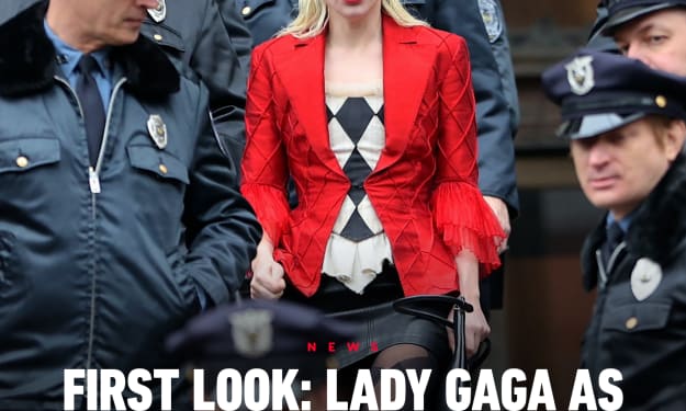 Lady Gaga was seen wearing the recognizable eye makeup and diamond-patterned clothing of Harley Quinn, a character from the upcoming sequel. It was the first time she was seen sporting this look. She was photographed on set, where she appeared to be with Gotham police officers and a group of citizens protesting.