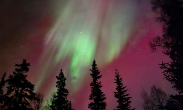 The delightful vision of you so surreal as your amber tresses flow and flicker in a flame-like manner underneath the enchanted Aurora Borealis.