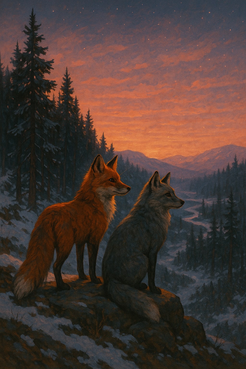 In a quiet forest nestled between snow-capped mountains and whispering pines, there lived two foxes. Though they shared the same russet coat and sharp eyes, they were as different as moonlight and fire.