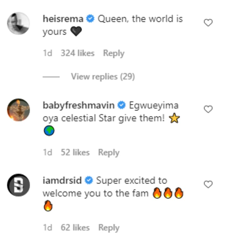 Whenever something like this happens, people are always quick to assume that there must be some bad blood, tension, or jealousy amongst the group – but that is not the case this time around. When Ayra made the official announcement of her signing, fellow MAVINS Johnny Drille, Rema, Baby Fresh, Dr. Sid and of course Don Jazzy where quick to congratulate her.