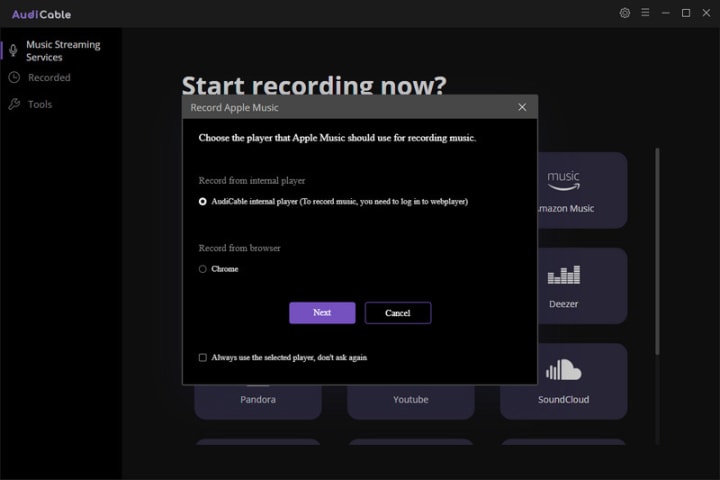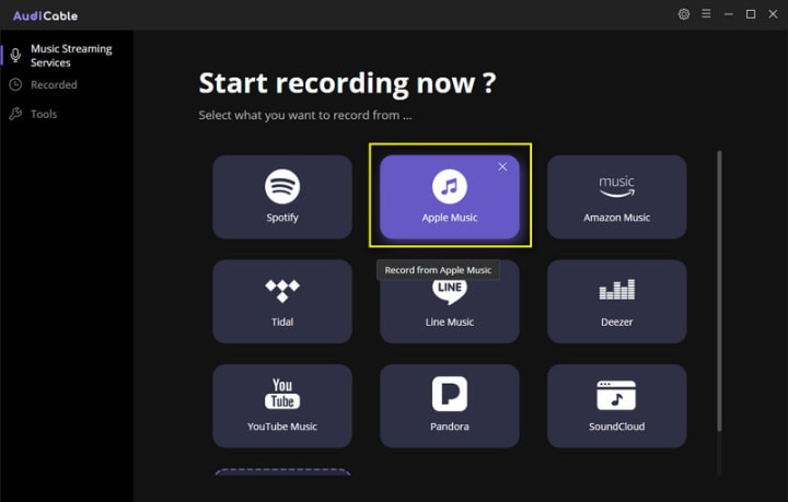 Firstly, download and launch AudiCable Audio Recorder. Then, click the "Apple Music" icon from the main interface. After that, the log-in window of Apple Music will automatically pop up, please log in your Apple Music account.