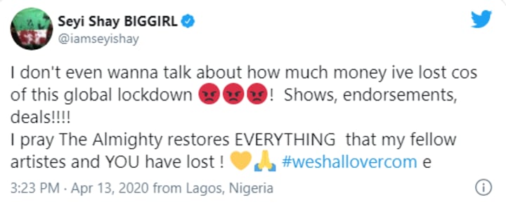 I don’t even wanna talk about how much money I’ve lost cos of this global lockdown! Shows, endorsements, deals!!!! I pray The Almighty restores EVERYTHING that my fellow artistes and YOU have lost ! #weshallovercome.
