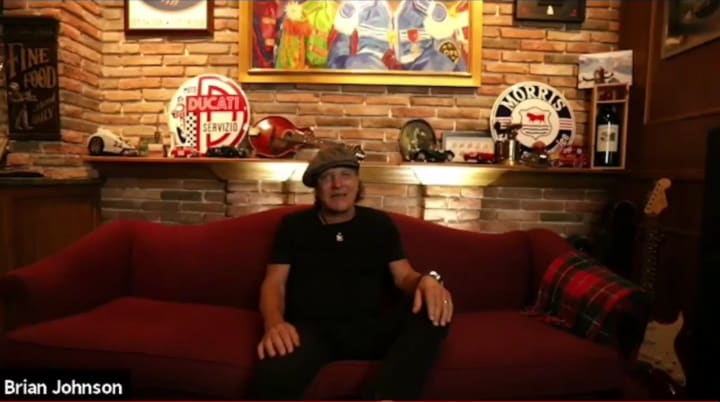Everyone is at home, Johnson comments on how he’s sitting on the same couch where he falls asleep watching sports. Williams and Cheuse have digital backgrounds inspired by PWR/UP, Angus Young is beside a Marshall stack.