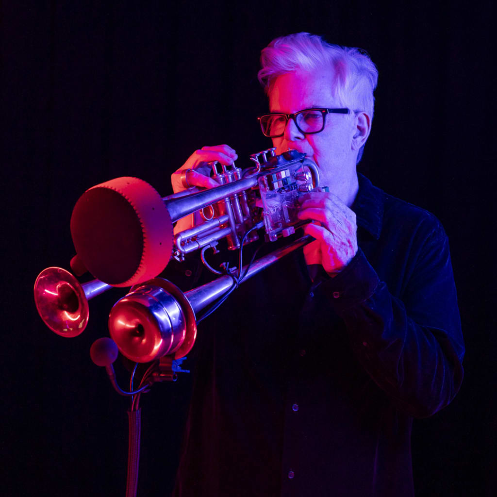 The Mutantrumpet, Neill’s self-invented hybrid instrument that combines traditional trumpet mechanics with electronics, sensors and MIDI controllers, operates not merely as a tool for performance but as a conduit for interaction with Sheldrake’s ideas.