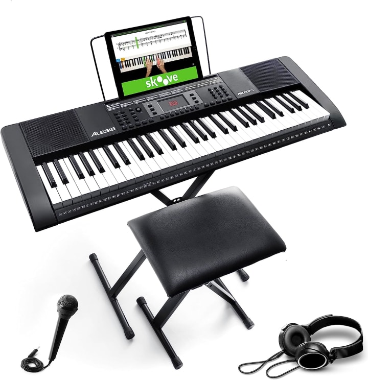 Alesis Melody 61 Key Keyboard Piano for Beginners with Speakers, Stand, Bench, Headphones, Microphone, Sheet Music Stand, 300 Sounds and Music Lessons: Alesis Melody 61 is tailor-made for beginners, offering an all-in-one package that includes not only the keyboard but also a stand, bench, headphones, microphone, sheet music stand, and music lessons. With a wide variety of sounds and lessons, it's an ideal choice for those starting their musical journey.