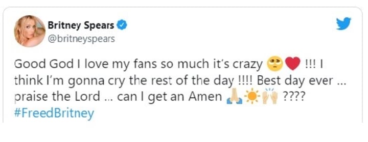 Her fans, myself included, are really happy about her well-deserved freedom from the clutches of her own father. Thousands of tweets are pouring in from all over the world. BS said she felt like crying for a whole day. And by that, she meant tears of joy.