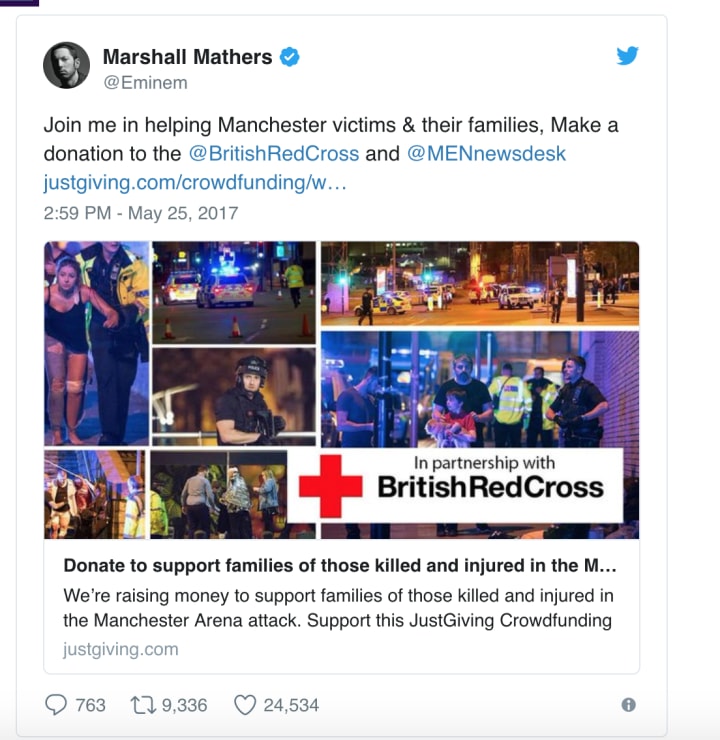 Eminem has also urged his social media followers to join him in helping the Manchester, England victims and their families. He asked his nearly 21 million Twitter followers to donate to the British Red Cross: