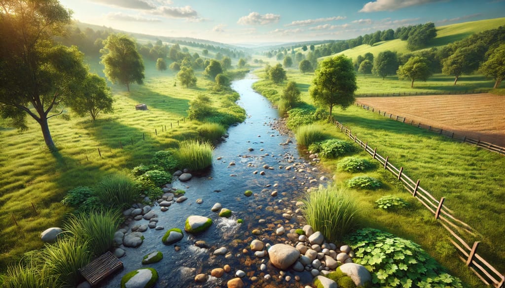 Surrounding the creek, the countryside breathes life into the setting. Grassy fields stretch far and wide, dotted with clusters of trees that offer shade and shelter. Wildflowers of various colors—yellow, purple, and white—pepper the landscape, their delicate forms swaying in harmony with the breeze. Here, the contrast between the steady movement of the creek and the stillness of the land creates a dynamic yet peaceful tableau.