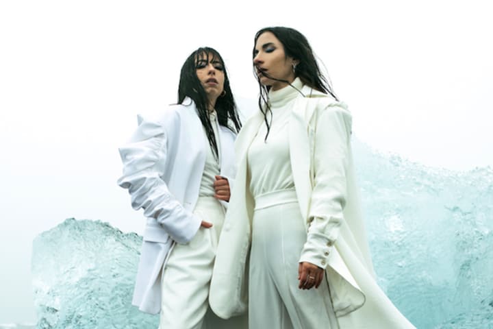 The set opens up with a striking shot of Giolì & Assia against the stunning Fjallsarlon Glacier Lagoon in Iceland. Giolì & Assia are carefully dressed in deliberate, all-white outfits with artistic, modern, and sleek silhouettes. The duo's fashion choices both reflect and emphasize the chilling Icelandic backdrop with its natural, near black-and-white beauty.