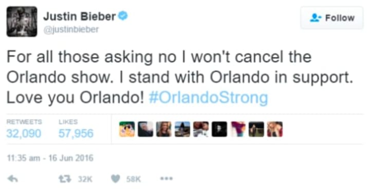 For all those asking no I won't cancel the Orlando show. I stand with Orlando in support. Love you Orlando! #OrlandoStrong - Justin Bieber on Twitter