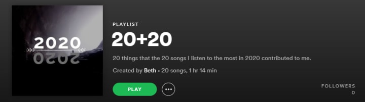 The name of my list is 20+20 because it expresses 20 things that the 20 songs I listen to the most in 2020 gave to me. When I listen to a song, I focus more on its melody than its lyrics, so the songs have very different meanings to me.