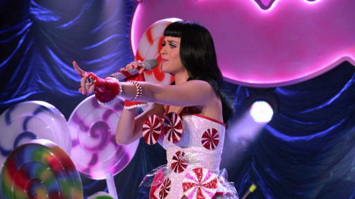 Perry covered in spinning peppermints, because when you have an album theme this fun you should go all out.