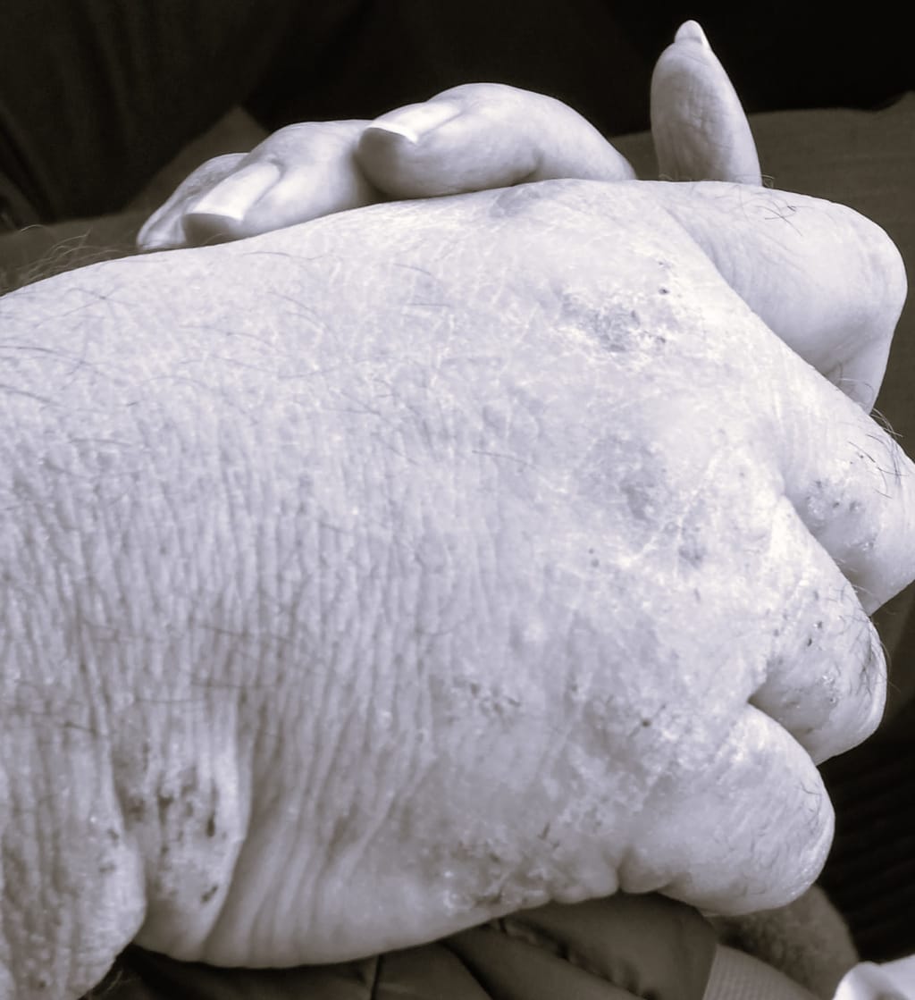Years of hard work have left his fingers calloused and marred with a distinctive jagged scar running down the inside of his center right finger and another making a perfect crescent moon atop his top knuckle on the left thumb. Patches of skin flake, crack, and bleed from exposure to severe elements in our chilly hometown and harsh chemicals used at his work. But each seemingly ugly flaw stands as a beautiful attestation of the devotion to providing for our little family. Rough as they appear, when his fingers trace my face they are soft and gentle, wiping away my tears, fears, and anxiety. When they entwine my own, I find myself home even in the middle of the Pacific Ocean.