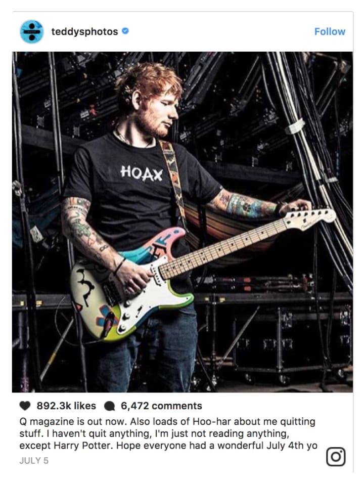 Sheeran clarified in an Instagram post that he hasn't quit anything, but he definitely wasn't reading.