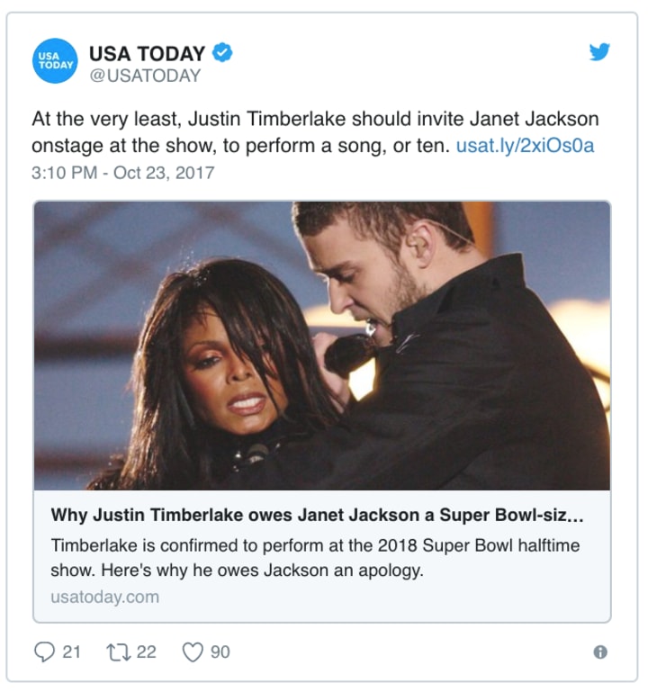 Though Timberlake apologized for the fiasco, saying it "was not intentional" and was "regrettable", Janet Jackson's fans believe the former N'Sync member needs to apologize to her personally for not coming to her defense or even accepting a portion of the blame. Some fans—and even USA Today—are calling for Janet Jackson to appear with Timberlake.
