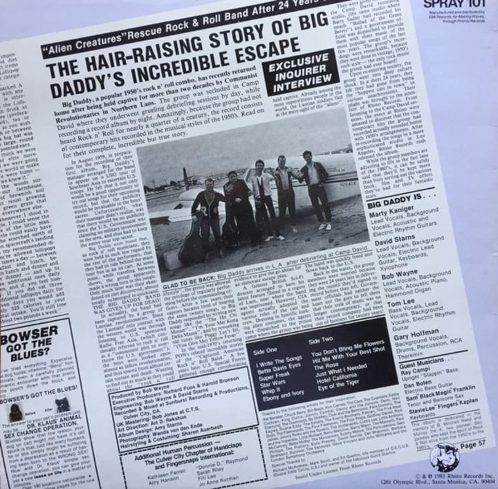 Big Daddy, a popular 1950's rock n' roll combo, has recently returned home after being held captive for more than two decades by Communist Revolutionaries in Northern Laos. The group was secluded in Camp David where they underwent gruelling debriefing sessions by day, while recording a record album by night. Amazingly, because the group had not heard Rock n' Roll for nearly a quarter of a century, the record comista of contemporary hits recorded in the musical styles of the 1950%. Read on for their complete, incredible but true story.