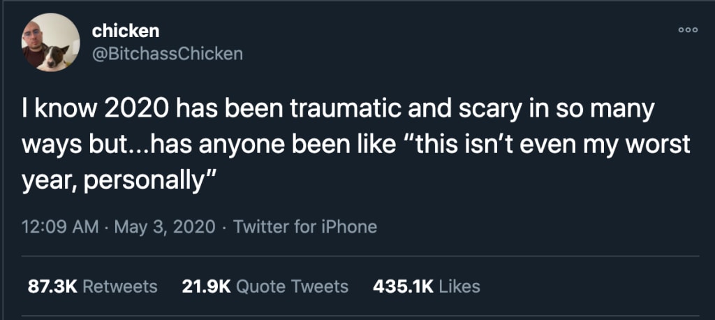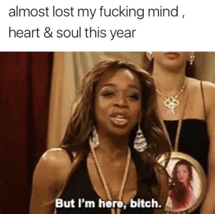 I was about to say "Here's to making 2021 my bitch," but I don't want to curse it, so I'll just say thanks for reading my story the whole way through. Mainly because I made and edited a lot of the memes myself, and that took a lot of work, but also because it's kind of embarrassing to write about all the stuff I went through this year and reveal my batshit insane Spotify playlist making habits. I appreciate you taking the time to read it. Here's one more meme I'll dedicate to the both of us for making it this far.