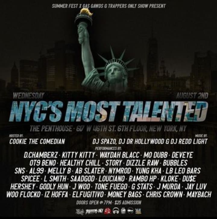 On Wednesday, August 2, 2023, hundreds of music lovers and independent artists hopped in the elevator up to the sixth floor of 617 46th Street to experience the real New York independent music scene at The Penthouse. The privately hosted event, NYC’s Most Talented, was presented by Summer Fest, Gas Gawds, and Trappers Only Show, bringing talent and party vibes from all the boroughs, New Jersey, Maryland, and one artist from as far as Illinois.
