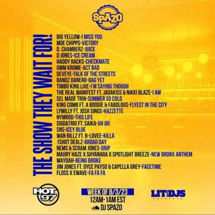 In the days after the independent music event, DJ Spazo announced the lineup for his radio show for the week of August 3, 2023. It seems NYC’s Most Talented did, in fact, impact decision-making for his lineup, with several artists present at the August 2 event making it to the radio. Hot 97 listeners heard “Juice” from D. Chamberz, “Talk of the Streets” from Deveye, “This Life” from Nymrod, “Being Broke” from Waydah, and “Icey Blue” from SNS all hit the airwaves.