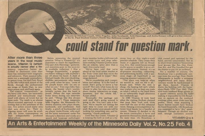 It was one of the first bands to play the legendary Jay's Longhorn. Vitamin Q's original claim to fame came from Hennings' song "Me Magazine." In 1981, the song appeared on the "Best of the Twin Cities Beat" album and TV show.