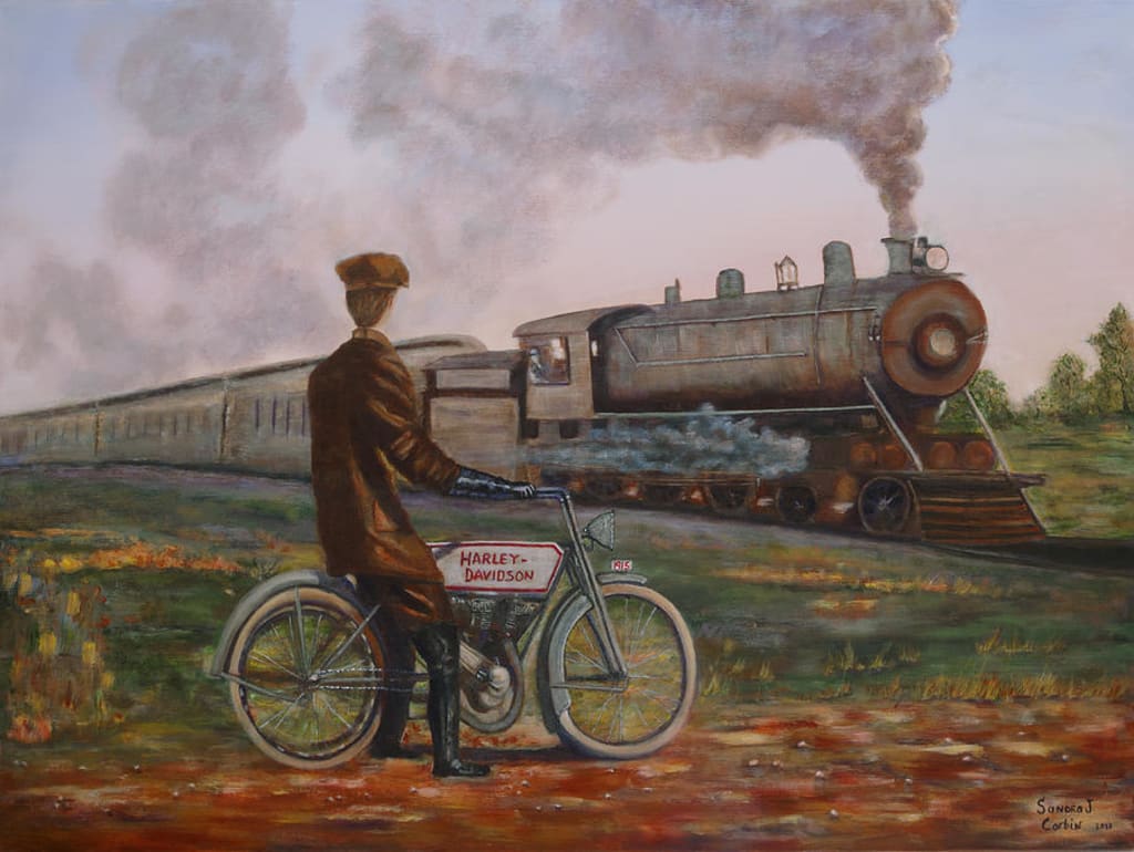 Vintage Motorcycle and Train painting by Sandra Corbin uploaded on Fineartamerica