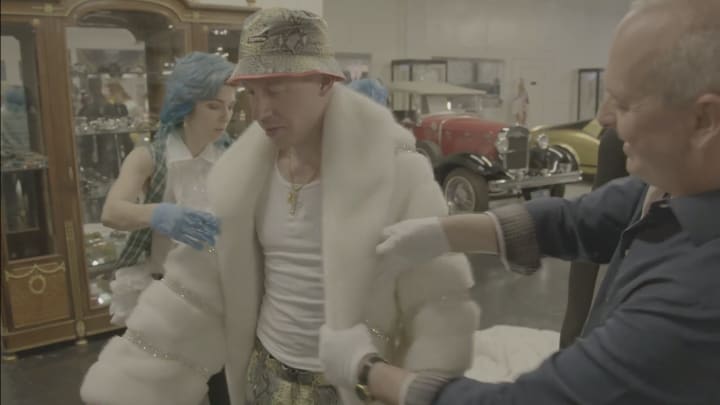 Blown away by the costumes and over-the-top luxe of Liberace's life, my guest became intrigued by some of the costume artifacts from HBO's Behind The Candelabra, which are exhibited at Liberace Garage. He spotted a crystal tailcoat, and I suddenly got an idea of how persuasive Macklemore can be. He didn't let up until it was on his back. We did the same with the giant white fur coat. But he was also very much looking out for his co-star, Kesha, who was off rehearsing. The Coral Cape from the film had attracted Macklemore's attention. He was determined to wear the Crystal jacket, and have Kesha wear the Coral Cape, on stage that night.
