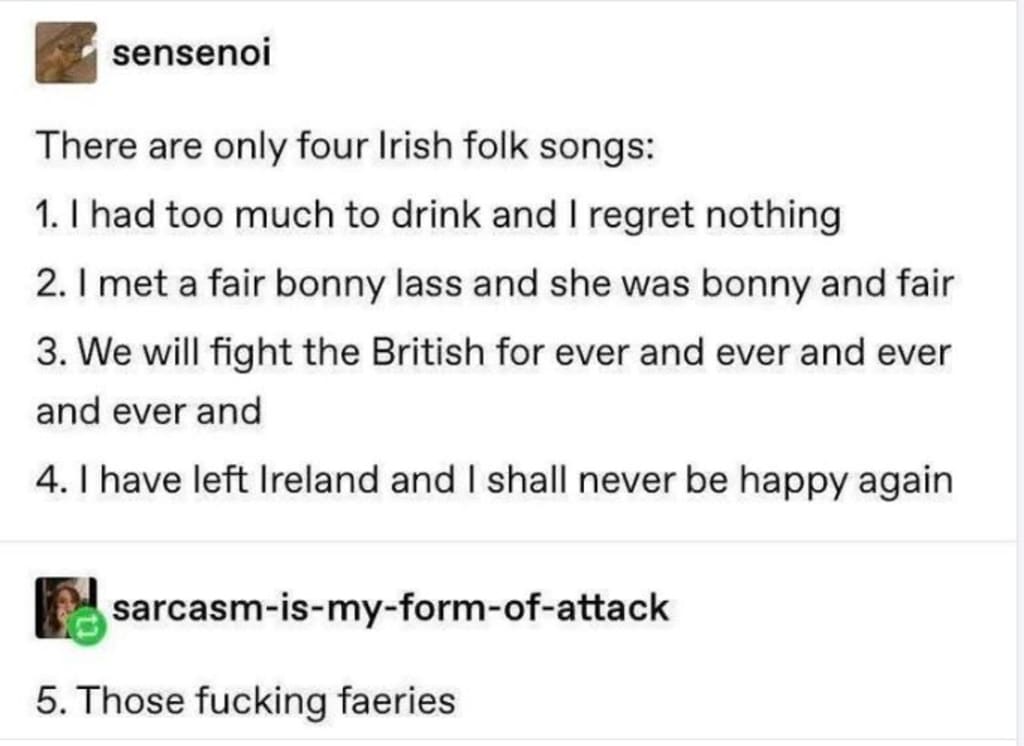 I saw this meme and thought I wonder if I can categorise Irish Folk Songs using these five headings, maybe two songs in each category. I know that this may not fit with the various Folk purists but I will share it in various Facebook Folk Groups and see what reactions I get.