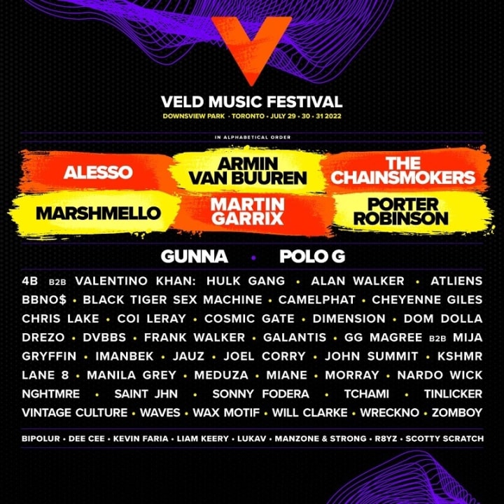 What's on the line-up for the next Veld Music Festival? The all-ages event is Canada's largest EDM festival and attracts daily crowds of more than 30,000. The festival's lineup features a mix of top international DJs, pop-crossover artists, and even rap stars. Headliners for this year's festival include Alesso, Martin Garrix, The Chainsmokers, Gunna, Polo G, Porter Robinson, and more.