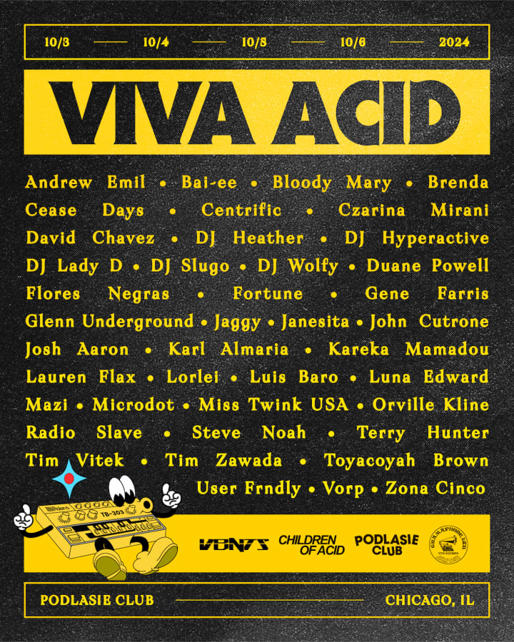 Celebrating Chicago’s vibrant Acid House scene and community from October 3rd - 6th at the Podlasie Club, in the city where it all began. Spread across four days, Viva Acid will be hosting a series of accessible events, workshops and conversations that foster creativity and further inspire innovation.