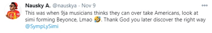 This was when 9ja musicians thinks they can over take Americans, look at simi forming Beyonce, Lmao Rolling on the floor laughing. Thank God you later discover the right way @SympLySimi