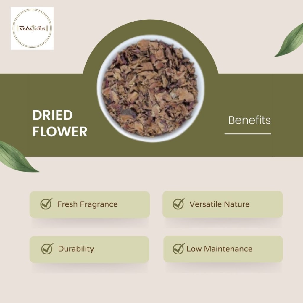 One of the leading manufacturers, suppliers, and wholesalers of dried flowers of the highest caliber in India is VedaOils. Find the greatest prices on dried flowers online; all of our dried flowers are real and organic. We dry our flowers naturally, without the use of artificial methods. In specific weather circumstances, it is air-dried naturally to keep its smell and lovely appearance.