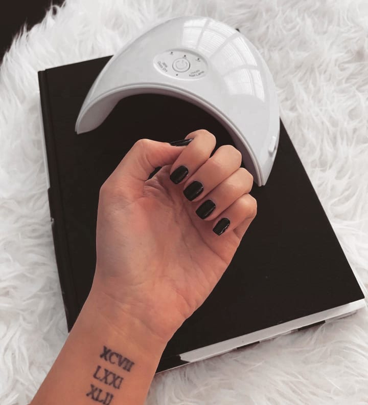 3. Apply 2-3 coats of your gel nail color of choice. The black color specifically is so full coverage and opaque that I felt like I only needed 1 coat but went for 2 to make sure that it lasts as long as possible. Cure for 120 seconds in between each coat of gel.