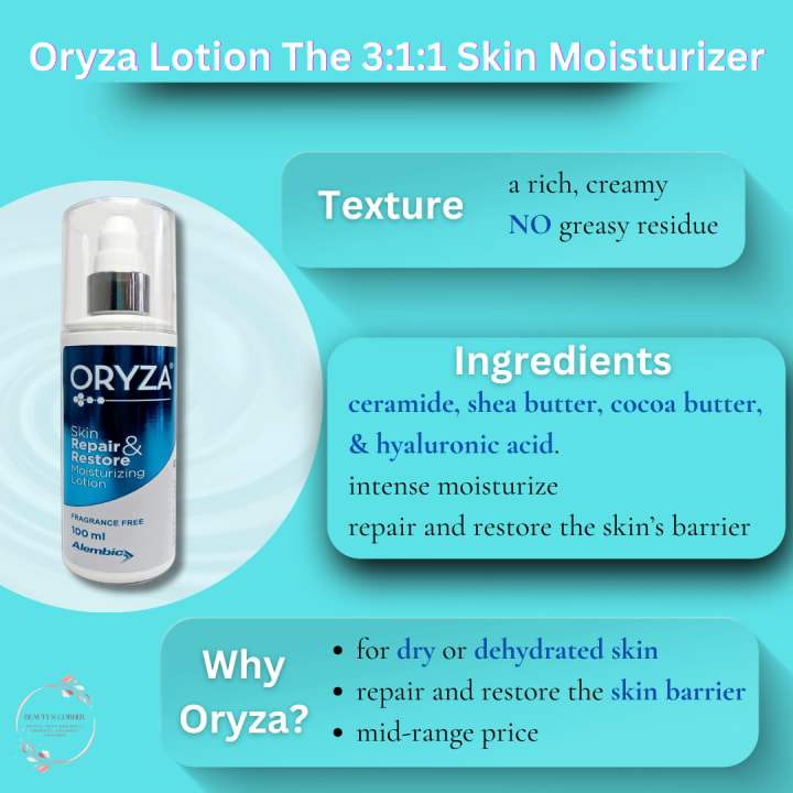 For Comprehensive Skin Repair: Oryza Lotion The 3:1:1 Skin Moisturizer is enriched with Ceramide, Shea Butter, Cocoa Butter, and Hyaluronic Acid, making it an excellent choice for those who need to restore and maintain skin health while deeply moisturizing and repairing dry skin.