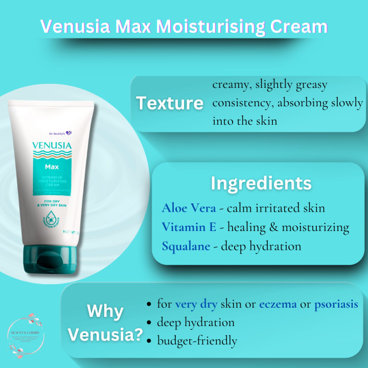 Texture: Rich and creamy, Venusia Max Moisturising Cream has a thick, slightly greasy consistency that absorbs slowly into the skin. It leaves a noticeable layer of moisture, making the skin feel deeply nourished.