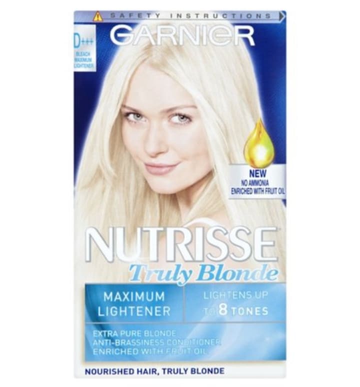 After you've done step two and ONLY after you've done step two, you can begin the bleaching process. I use this bleach (in picture above) and I swear by it! This is the only bleach that I've used that fully works on my very stubborn hair, so hopefully it will work on yours to. It's called Garnier Nutrisse truly blonde. On the back of the pack you'll see a little hair chart that shows the hair going from dark brown to light blonde (but don't get your hopes up). This product works amazingly, but like I said earlier, there is no way to get your hair from dark to platinum overnight.
