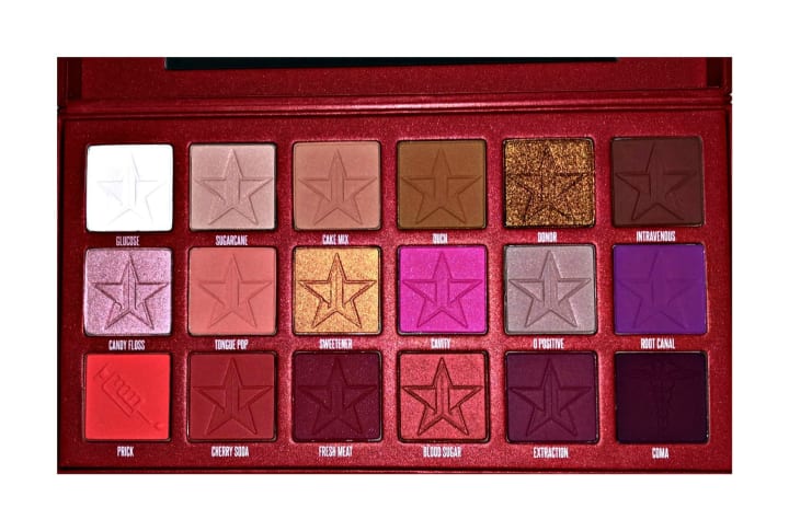 First off we are going to DIVE into this Eyeshadow Palette! Bitch... He didn't disappoint! This feels heavy! Almost like I want to take out the eyeshadows and put my own crap in here! It retails for $52. A little steep considering that most palettes cost about $45, but it's Jeffree, so you already knew that I was going to pay the extra moolah! The palette altogether has 18 shades, including from left to right: Glucose, SugarCane, Cake Mix, Ouch, Donor, Intravenous, Candy Floss, Tongue Pop, Sweetener, Cavity, 0 Positive, Root Canal, Prick, Cherry Soda, Fresh Meat, Blood Sugar, Extractor, and Coma.