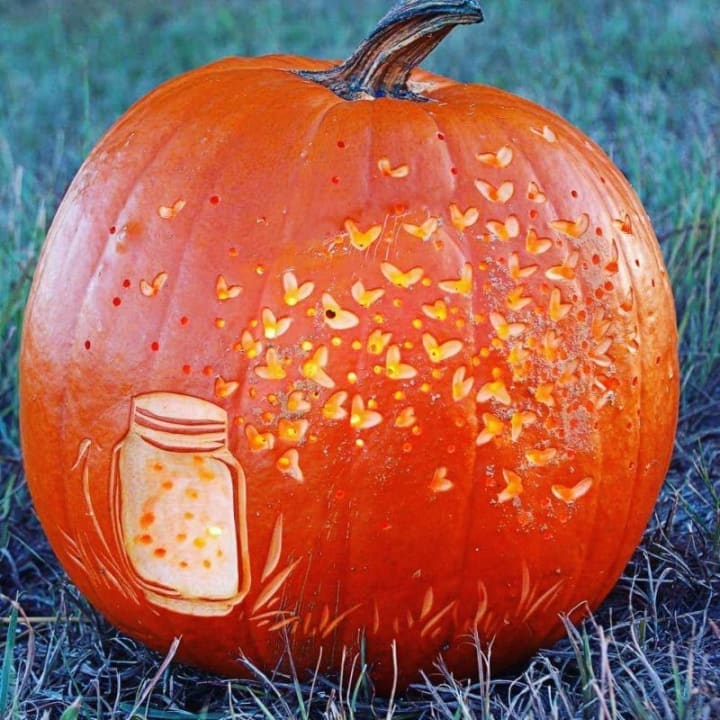 Carved bumblebees and mason jar adorn this farmhouse-inspired pumpkin. Image: Instagram @octoberfallqueen