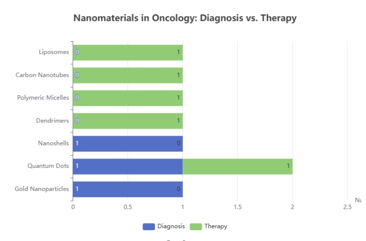 One prominent example of targeted drug delivery is the use of liposomes and polymer nanoparticles. Liposomes are microscopic lipid bubbles that can encapsulate drugs, and they have been used clinically for decades (e.g., Doxil for ovarian cancer). Polymer nanoparticles, made from biodegradable polymers, can similarly carry drugs and even respond to environmental cues (like pH changes) to release the drug at the right place and time. These carriers have made it possible to treat diseases that were previously untreatable or extremely difficult to treat. For example, certain anti-cancer drugs can now be delivered to tumors in a controlled manner, significantly improving outcomes. The chart below illustrates the wide range of nanomaterials used in both diagnosis and therapy, highlighting the versatility of nanotechnology in medicine.
