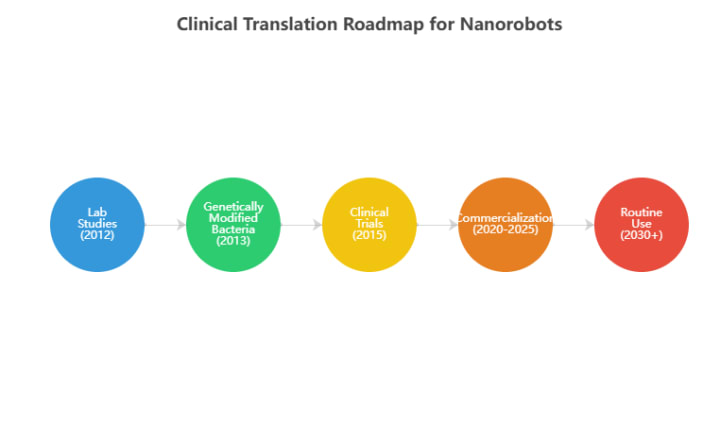 Another potential application of nanorobots is in diagnostics and monitoring. Tiny robots could continuously patrol the body, collecting data on health indicators and reporting back to a doctor. They might detect early signs of disease (like the presence of a few cancer cells or a pathogen) before symptoms appear, enabling proactive treatment. In the future, we might see “nanorobot doctors” that periodically examine the body’s systems and even make minor repairs on the spot – much like a mechanic might perform routine maintenance on a machine. While these scenarios sound like science fiction, there have been significant developments in the lab. Scientists have already created simple nanorobots that can move in a controlled manner, and research is ongoing to imbue them with more complex functions. The chart below provides a projected roadmap for the development and clinical translation of these nanorobots.