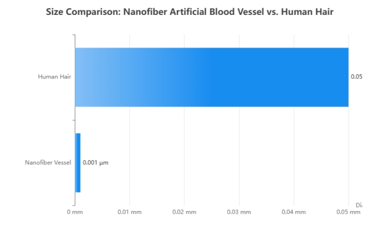 One notable example of nanotechnology in tissue engineering is the creation of artificial blood vessels. Researchers have used nanoscale materials to fabricate tiny blood vessel segments that can be implanted to bypass or replace damaged vessels. In one study, scientists developed a biomimetic blood vessel using an electrospinning technique to create an extremely thin nanofiber mesh, resulting in the world’s smallest artificial blood vessel (measuring only a few millimeters in diameter) . This nanofiber scaffold was populated with cells and showed great promise in animal studies, demonstrating that engineered blood vessels could function in the body. Such innovations are crucial for repairing cardiovascular damage and could eventually help patients who need organ transplants by providing replacement parts grown from their own cells. The following chart shows the size comparison of this breakthrough artificial blood vessel with a human hair, highlighting the remarkable scale of nanotechnology.
