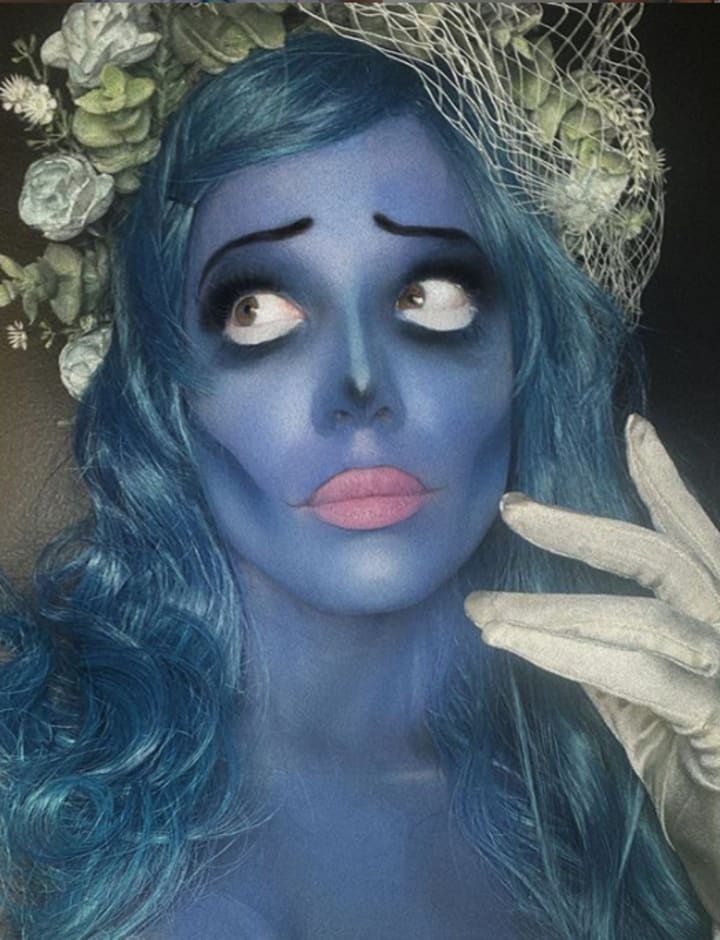 Her makeup looked almost exactly like the animated character in The Corpse Bride. The teal hair and floral hair accessories complemented the look well.