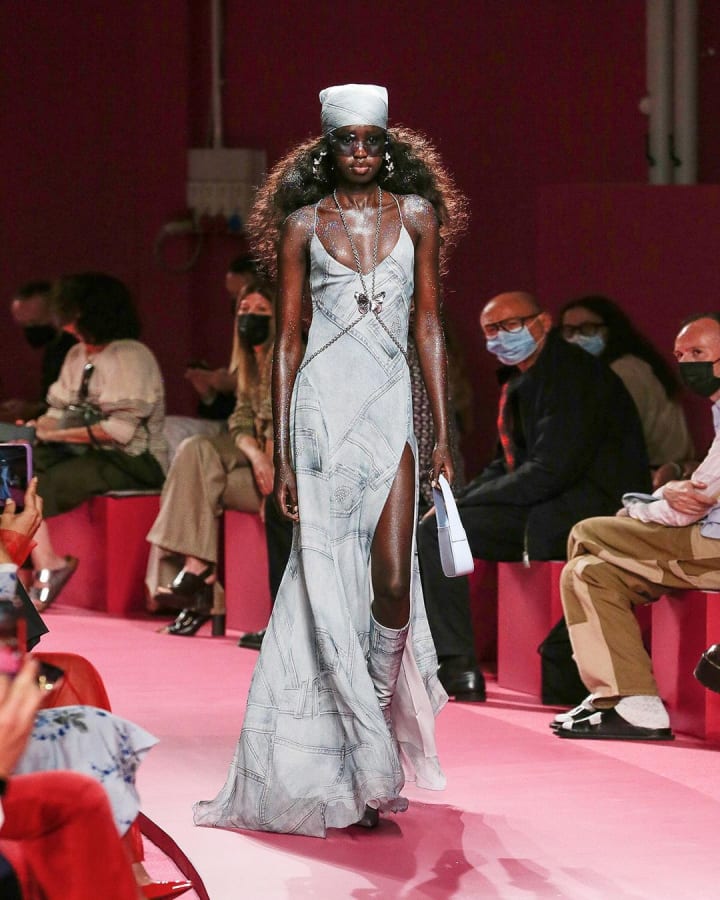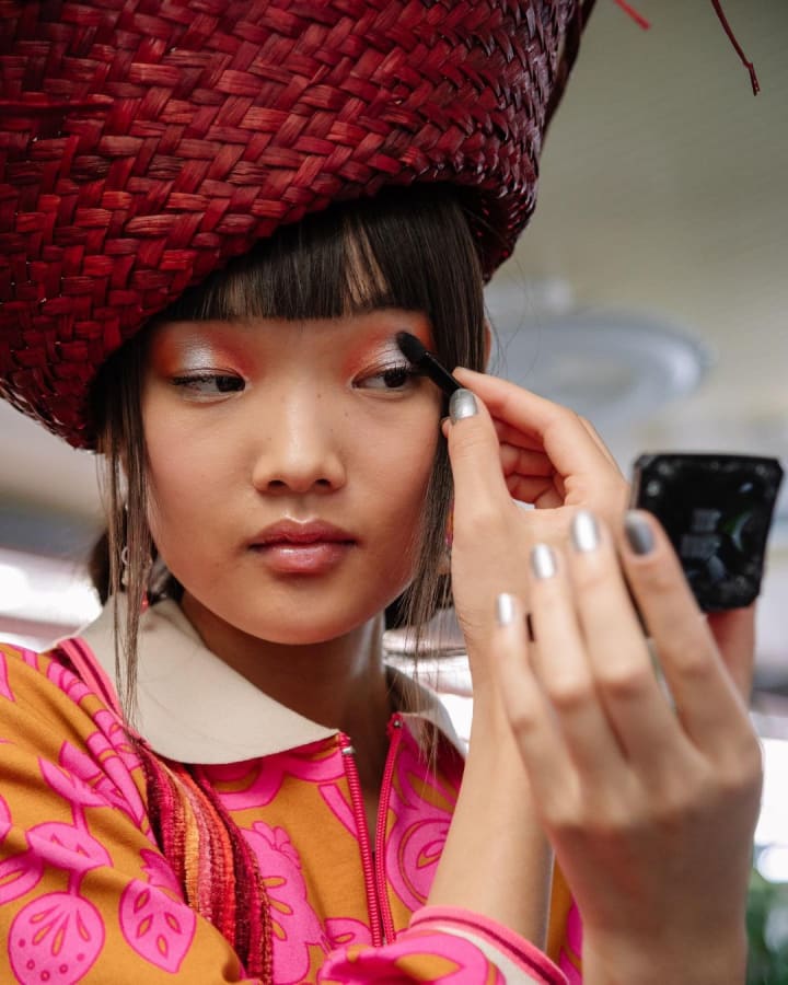 Excuse me when I try this lime green winged eyeshadow with turquoise eyeliner and golden green highlights. This look, which Pat McGrath created for Versace, is everything makeup should be in the spring of 2022: bright, fun, and playful. In case you haven't figured it out yet, one of the biggest makeup trends for spring 2022 is a pop of color in the inner corners of the eyes, shimmering to the side, as seen on the Lanvin model.