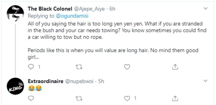 All of you saying the hair is too long yen yen yen. What if you are stranded in the bush and your car needs towing? You know sometimes you could find a car willing to tow but no rope. Periods like this is when you will value are long hair. No mind them good girl...