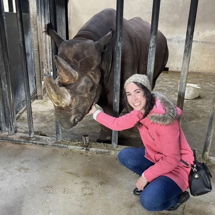Forsberg first met black rhinos KJ and his mother, Bibi (who has since, sadly, passed on), at the Sedgwick County Zoo, and has been fortunate enough to visit repeatedly. "KJ recognizes me and my family now, probably because we've given him so many treats," she said.