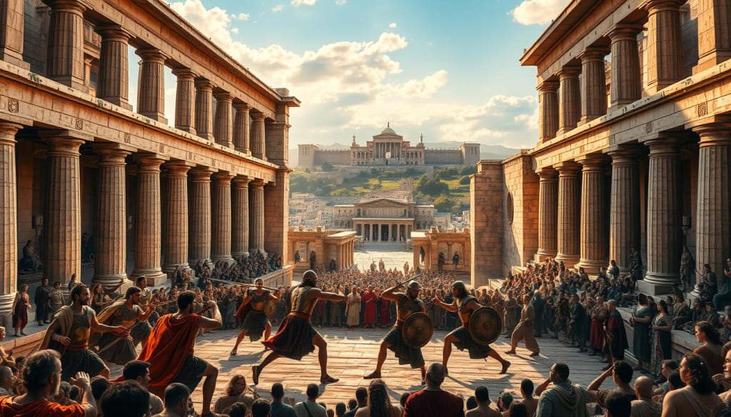 A grand ancient Greek amphitheater, with towering stone columns and dramatic architectural features. In the foreground, a scene from Aeschylus's epic play "Seven Against Thebes" unfolds - heroic warriors in bronze armor and flowing cloaks, locked in fierce combat, their swords clashing in the golden light of the setting sun. In the middle ground, a throng of spectators, dressed in traditional Hellenic garb, watch the action with rapt attention. The background features a majestic cityscape, with the imposing walls of Thebes rising up in the distance, a testament to the high stakes and epic scale of the legendary battle.