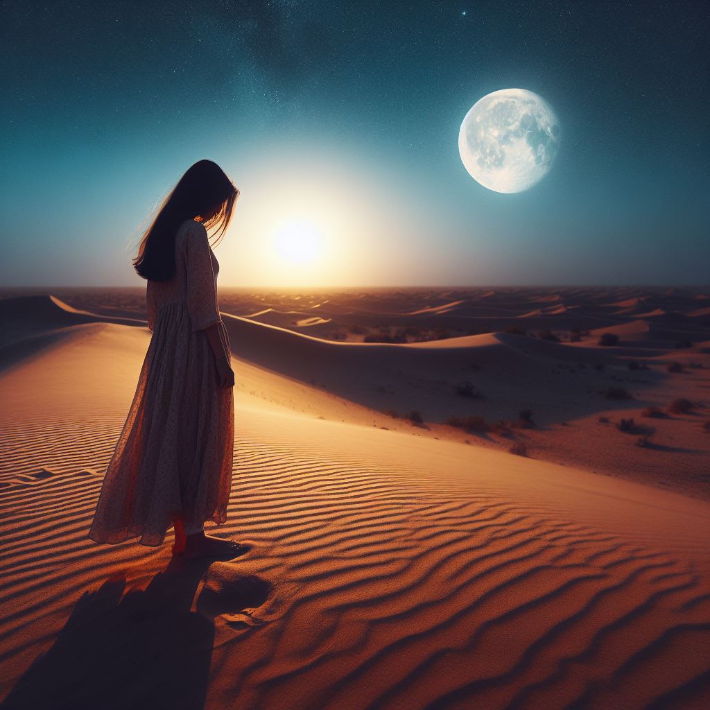 Suddenly, a mournful howl echoed across the dunes, sending shivers down Elara's spine. It was the cry of a lone coyote, and it served as a stark reminder of the dangers that lurked under the cloak of night. With a final glance at the moon, now high in the sky, casting its silvery light on the endless sands, Elara turned and hurried back towards her shelter.