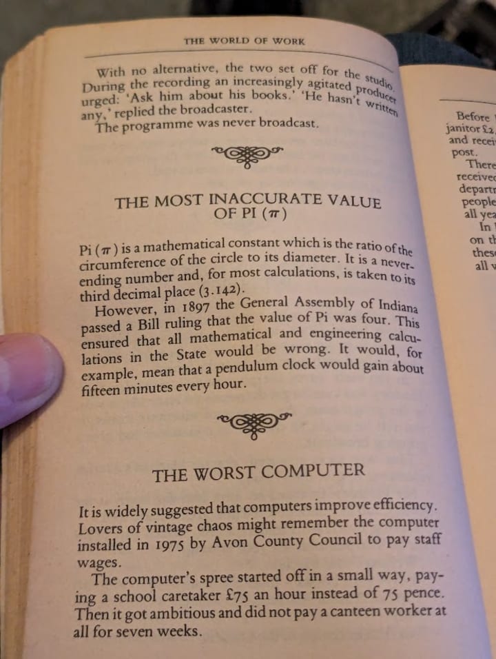 I was gobsmacked by Indiana rounding up the value of π to four to make calculations easier, although I could see that happening again today.